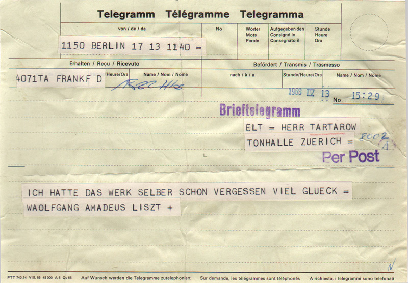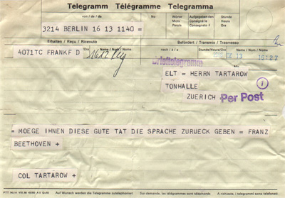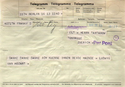 Geheimnisvolle Telegramme vor dem Konzert in Künstlerzimmer von unbekannten Absendern.